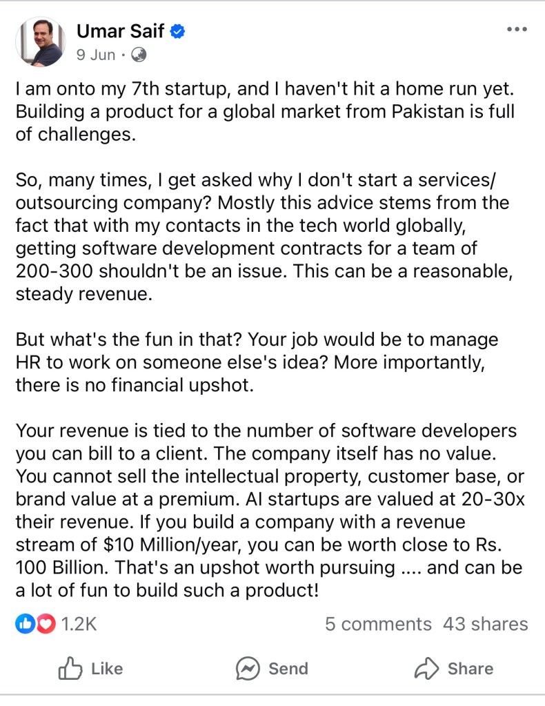 پوچھنا چاہیے کہ عمر سیف جیسی شخصیت جب سروسز اور آؤٹ سورسنگ سیکٹر کو “غیر دلچسپ” کہے گی تو اس کا پاکستان کی آئی ٹی کی صنعت پر کیا اثر ہو گا ؟ کیا عمر سیف جیسے لوگ آنے والے وقت میں بھی پاکستان میں کسی Infosys کا وجود نہیں دیکھ رہے ؟